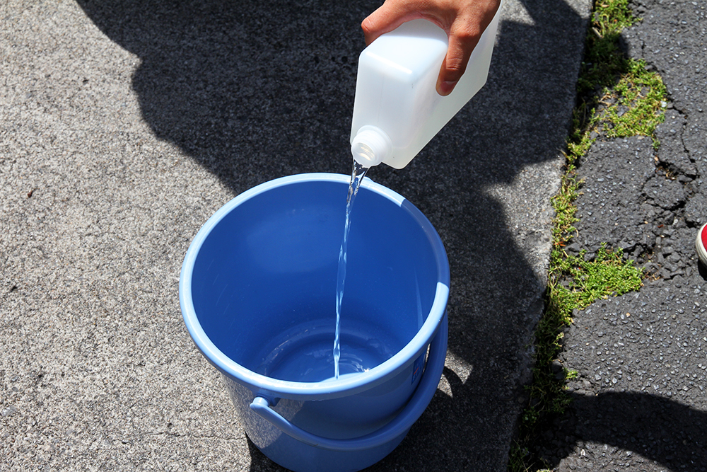 カーシャンプーを入れた次に、水をバケツに注ぎます。